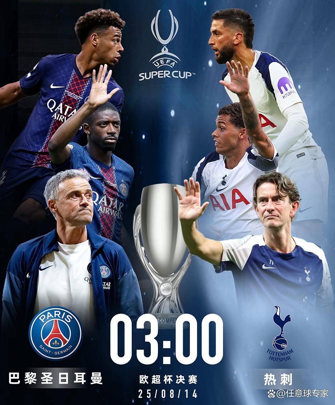 北京时间8月14日3:00,2025年欧洲超级杯在乌迪内斯弗留利球场打响,对阵双方是上赛季欧冠冠军巴黎圣日耳曼和欧联杯冠军托特纳姆热刺。