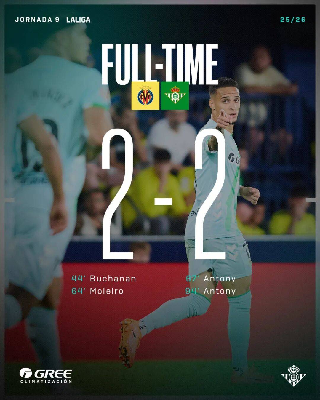 皇家贝蒂斯上轮西甲客场2-2逼平比利亚雷亚尔结束三连胜,这场比赛是双方争夺欧冠资格的早期交锋。比利亚雷亚尔由Tajon Buchanan和Alberto Moleiro连入两球,加拿大边锋本赛季从国际米兰正式加盟,已经打入四球,22岁的Alberto Moleiro则从拉斯帕尔马斯加盟。不过皇家贝蒂斯由安东尼梅开二度扳平比分,他也收获了本赛季西甲处子球。皇家贝蒂斯本赛季开局比上赛季要好,他们目前落后第四的西班牙人两分。皇家贝蒂斯在上周四的欧罗巴联赛中客场0-0战平比利时球队亨克,这是他们连续四个客场比赛的最后一场。安东尼和中卫戈麦斯是唯一连续首发出场的球员,亨克前锋吴贤揆下半场反击中射门中柱错失良机,最终双方均无建树互交白卷。